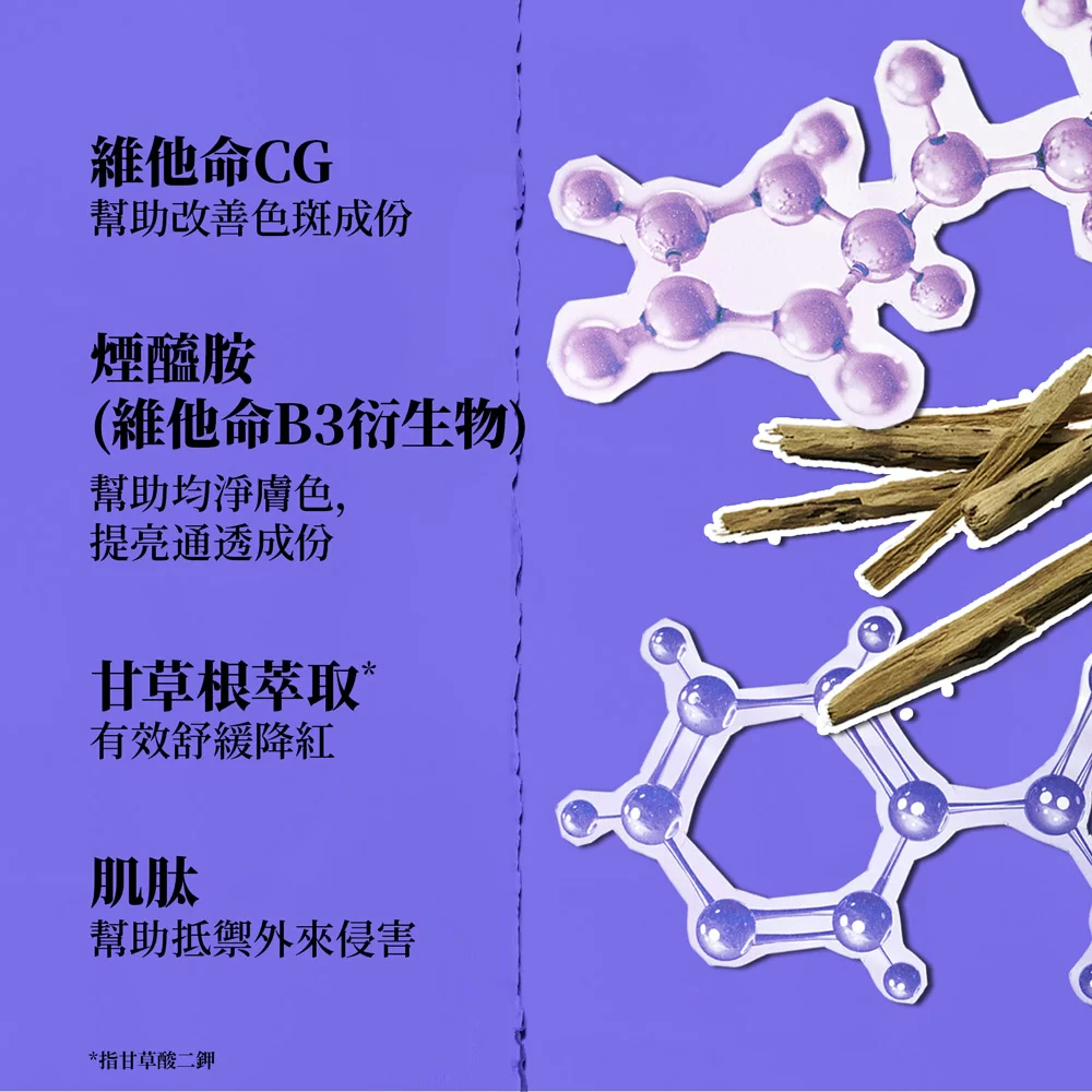改善膚色不均、暗沉及痘印,7天提升肌膚淨透 擺脱暗沉蠟黃,1天舒緩敏感降紅,肌膚重現透亮感 幫助抵禦外來侵害,煥發原生玻璃肌 +87%即時保濕#,24小時長效保濕 #所有肌膚適用,包括敏感及暗瘡肌膚