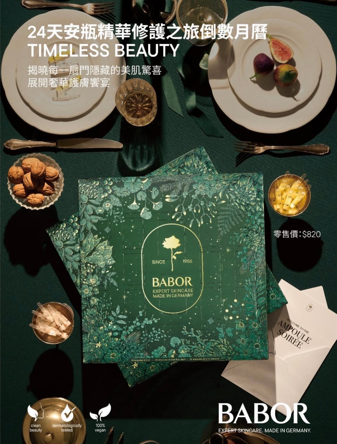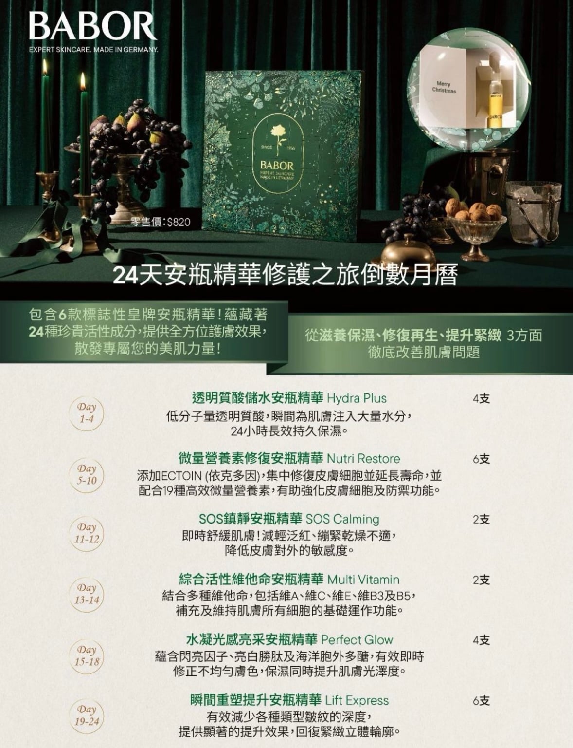 24天安瓿精華護理療程,集合6款皇牌安瓿,隱藏在每扇門後的醫學級美容力量,能精準有效地為您逐步改善肌膚問題,注水修復、補充能量、提升緊緻。助您釋放最大美麗潛能,於佳節中綻放閃爍亮麗! Hydra Plus:透明質酸儲水安瓶精華(4支) 深層補水,保持肌膚24小時水嫩飽滿。 SOS Calming:SOS鎮靜安瓶精華(2支) 迅速舒緩肌膚不適,適合曬後護理。 Multi Vitamin:綜合活性維他命安瓶精華(2支) 提供19種必需營養素,增強肌膚健康。 Perfect Glow:水凝光感亮采安瓶精華(4支) 即時亮白,改善暗沉,細緻毛孔。 Lift Express:瞬效重塑提升安瓶精華(6支) 提升緊緻,撫平皺紋,效果持續6小時。 Nutri Restore:微量營養素修復安瓶精華(6支) 為疲倦肌注入活力,重現肌膚光澤。
