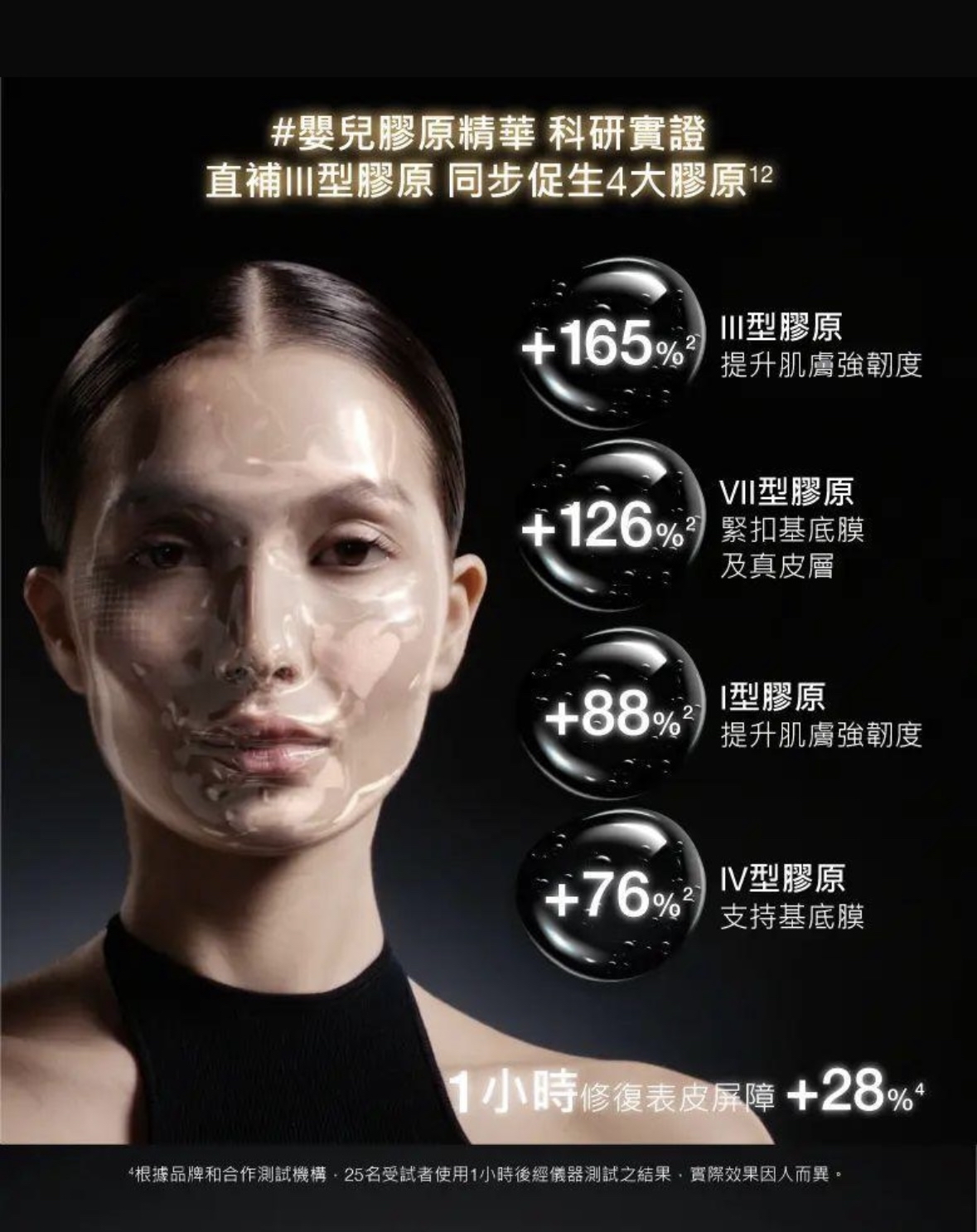 從20歲起,皮膚裏的III型膠原水平迅速下降,於成年人肌膚中之比例只有8-12%⁴。III型膠原不斷流失,其合成速度趕不上流失速度,因而導致粗糙、皺紋、鬆弛等衰老跡象,皮膚自身修復能力削減。 複合抗老配方蘊含III型膠原*、多重胜肽**及透明質酸,卓效促生4大膠原¹,重塑彈嫰緊緻,提升臉頰輪廓。III型膠原被稱為「嬰兒膠原」,是嬰兒比成年人皮膚柔軟彈嫰的關鍵原因之一。從20歲起,其水平迅速下降,導致皺紋、鬆弛等衰老跡象,皮膚自身修復能力削減。 產品針對鬆弛、缺乏彈性的肌膚,直接補充III型膠原,體外測試更顯示有助促生4大膠原