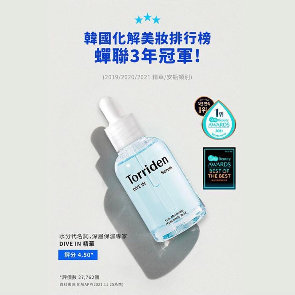 韓國No.1 國民保濕精華!長居榜首 2022 Olive Young Award 精華類 第三名 連續3年! 2019-2021 「Hwahae」化解韓國No.1美妝測評年度大賞-最佳精華類別 第一名 2021年度錄入化解名譽殿堂榜單 Hwahae Hall of Frame Award 2021 精華類別 第一名 2020 Glow Pick Award 精華類別 第一名 2021 Olive Young Award 精華類 TREND CLEAN BEAUTY 3秒精華極速為肌膚注滿水份 深層補水 舒緩修護 由內而外清透潤澤補水精華 3秒內極速補水,Torriden核心極致超保濕成份5D-複合透明質酸 低分子透明質酸瞬間深入肌虎最深層,為肌膚注入源源水動力 D-泛醇維生素B5、尿囊素、羥基積雪草苷,舒緩鎮靜肌膚 透明超水配方超易吸收、清爽補水、不黏膩 通過低敏性測試,不含香料及刺激性物質 所有肌膚適用,特別推薦缺水肌,敏感肌也適用 SkinCeuticals B5補水精華平替 重點成份 : 5D複合透明質酸、D-泛醇維生素B5、孔雀石提取物 成就3秒補水 → Torriden獨特5D-複合透明質酸(Hyacross)極緻5重保濕成份:為超高分子量的天然保濕因子透明質酸複合物,其實是由5種高、中、低分子保濕透明質酸組成,不同的透明質酸能各自深入肌膚不同皮層部位,全方位5重保濕,達至層層補水、鎖水、長效保濕滋潤效果,肌膚即時水潤富有彈性 Torriden 研發產品理念承諾精選優質無害成份,不使用動物成份,符合Vegan認證 和使用環保物料。